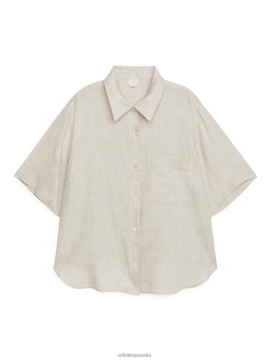 Cămașă de lenjerie cu mâneci scurte, largi, cu pliante. Tăiați pentru o potrivire relaxată, stilată cu un guler obișnuit, un buzunar cu un singur piept și o hemline curbă. Butoanele Mother of Pearl – ceea ce înseamnă că acest produs conține părți ne -textile de origine animală.