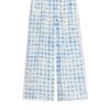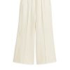 Pantalonii confecționați dintr -un amestec fluid de vâscoză și lenjerie. Stilat cu elastice și tracțiune la talie, buzunare laterale și cute presate. Un stil de lungime completă, cu o siluetă de flăcări.