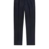Pantalonii confecționați dintr -o țesătură de lână italiană, țesute într -o construcție de hopsack – o țesătură de coș liber, cu o textură geometrică subtilă, care face ca îmbrăcămintea să fie durabilă, aerisită și rezistentă în mod natural la rid. Tăiați pentru o potrivire subțire cu picioarele drepte, pantalonii prezintă cute presate, buzunare laterale înclinate și buzunare cu jetare în spate. talie pre-construită cu bucle de centură, închidere cu cârlig și bară și o muscă cu fermoar. Pantalonii conțin 100% lână RWS, certificate de Control Union 815473. Produsele certificate la standardul de lână responsabilă (RWS) conțin fibre de lână din fermele certificate independent la cerințele de asistență animală și de gestionare a terenurilor.