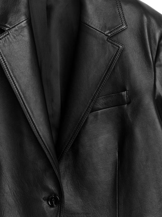 Blazer din piele proiectat cu o potrivire supradimensionată, tăiată dintr-o piele moale premium, care a suferit un proces de bronzare fără crom. Un stil cu un singur sân, cu lungime regulată, cu căptușeală cu acetat, buzunare duble cu flaps și un buzunar cu piept.