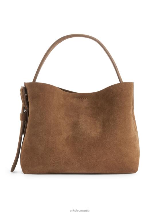 Geanta încrucișată de dimensiuni medii concepute din piele de căprioară. detaliat cu o închidere magnetică și un mâner larg de sus, cu o cataramă acoperită cu piele de căprioară. Atât cureaua de umăr, cât și mânerul superior sunt reglabile în lungime. Geanta deține un compartiment mediu cu închidere cu fermoar. Dimensiuni 23 cm x 19 cm x 10,5 cm. Suede-ul folosit a fost supus unui proces de bronzare fără crom.