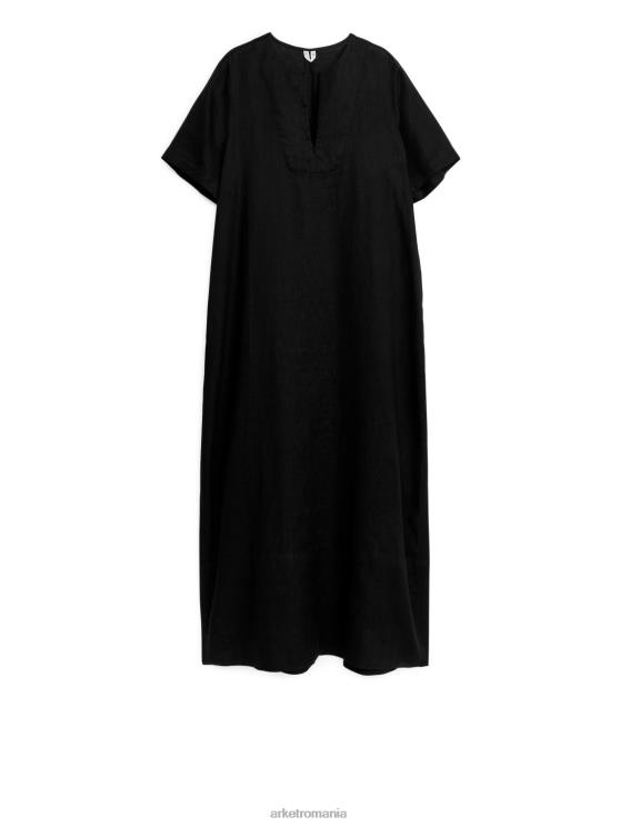 rochie de tunică maxi realizată din lenjerie pură. Un stil cu mânecă scurtă, cu o deschidere a gâtului de fante. Tăiere dreaptă cu fante înalte la cusături laterale. neliniat.